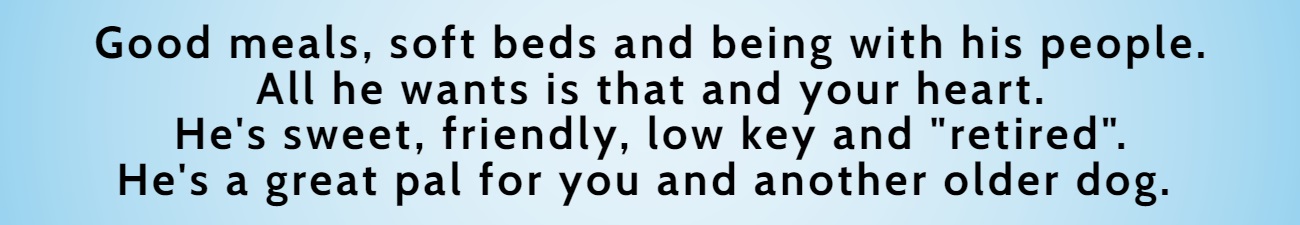 ORIGINAL BIO: Samson is a retired breeder dog who needs a patient, loving home where he can lay his head. Would that home be yours? You need to have patience for him to come out of his shell and learn to be a pet not a breeder dog. You can see the longing in his eyes when you look at him. He wants to trust, but he is just not sure. Give him that reassurance.